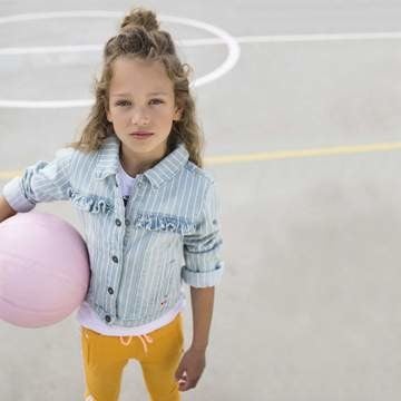 #denimgirl! Dit lichtblauwe denim jack met witte verticale strepen willen alle meisjes hebben. De jas is gemaakt van supercomfy stretchdenim en is voorzien van een drukknoopsluiting, drukknopen bij de mouwen, steekzakken en binnenzakken. De ruches maken het stijlplaatje compleet. Match girly met rokje of ga voor 'denim chic' met jeans. T'ND denim girls' choice!