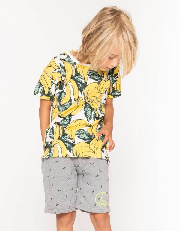 Jongens t-shirt met ronde hals en korte mouwen in wit met een gele en groene bananenprint. Het t-shirt heeft een wit 1x1 rib boordje langs de hals en splitjes aan de zijkant.