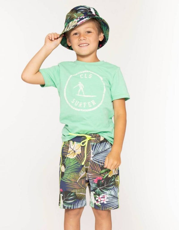 Jongens t-shirt met ronde hals en korte mouwen in mintgroen met een surfprint. Het t-shirt heeft een mintgroen 1x1 rib boordje langs de hals. Voorop eeen grote surprint.