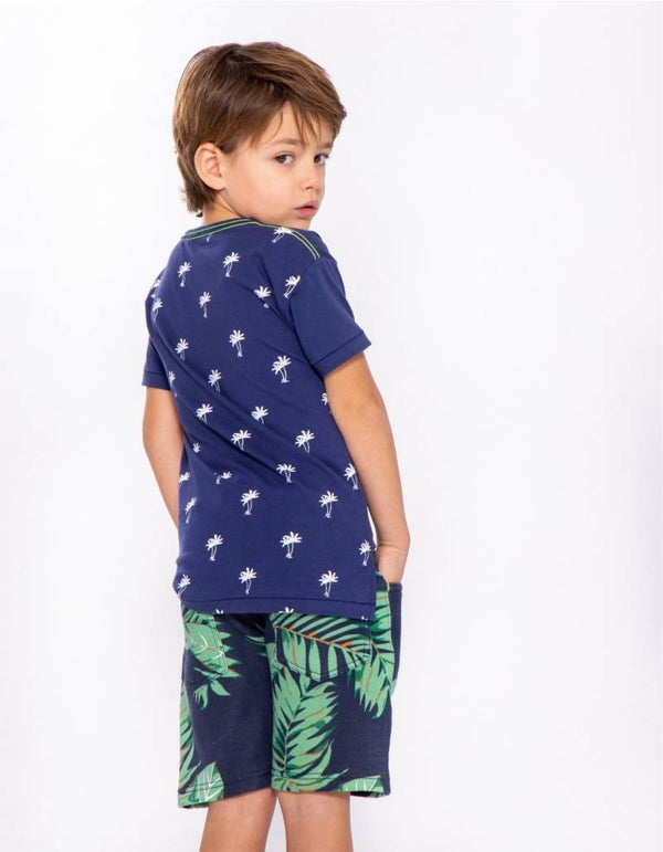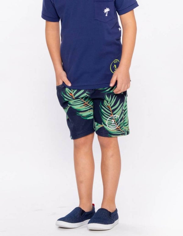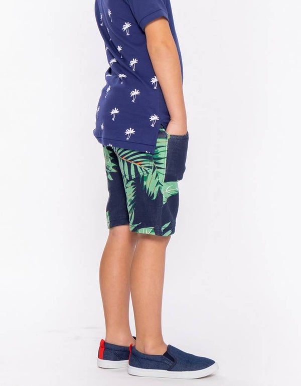 Jongens korte joggingbroek (5- pocket model) in navy met een groene bladerenprint. De korte broek heeft een tailleband, gulp met knoop, 3 zakken aan de voorkant en 2 zakken aan de achterkant. Gemaakt van 100% cotton fleece.