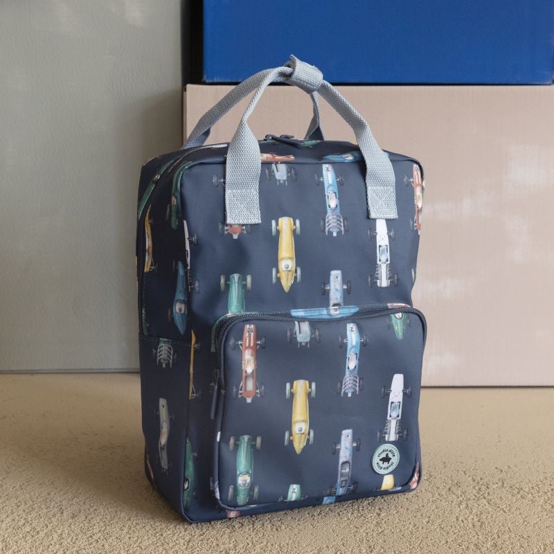 Stoere snelle retro race-auto's op deze rugzak van Studio Ditte.
