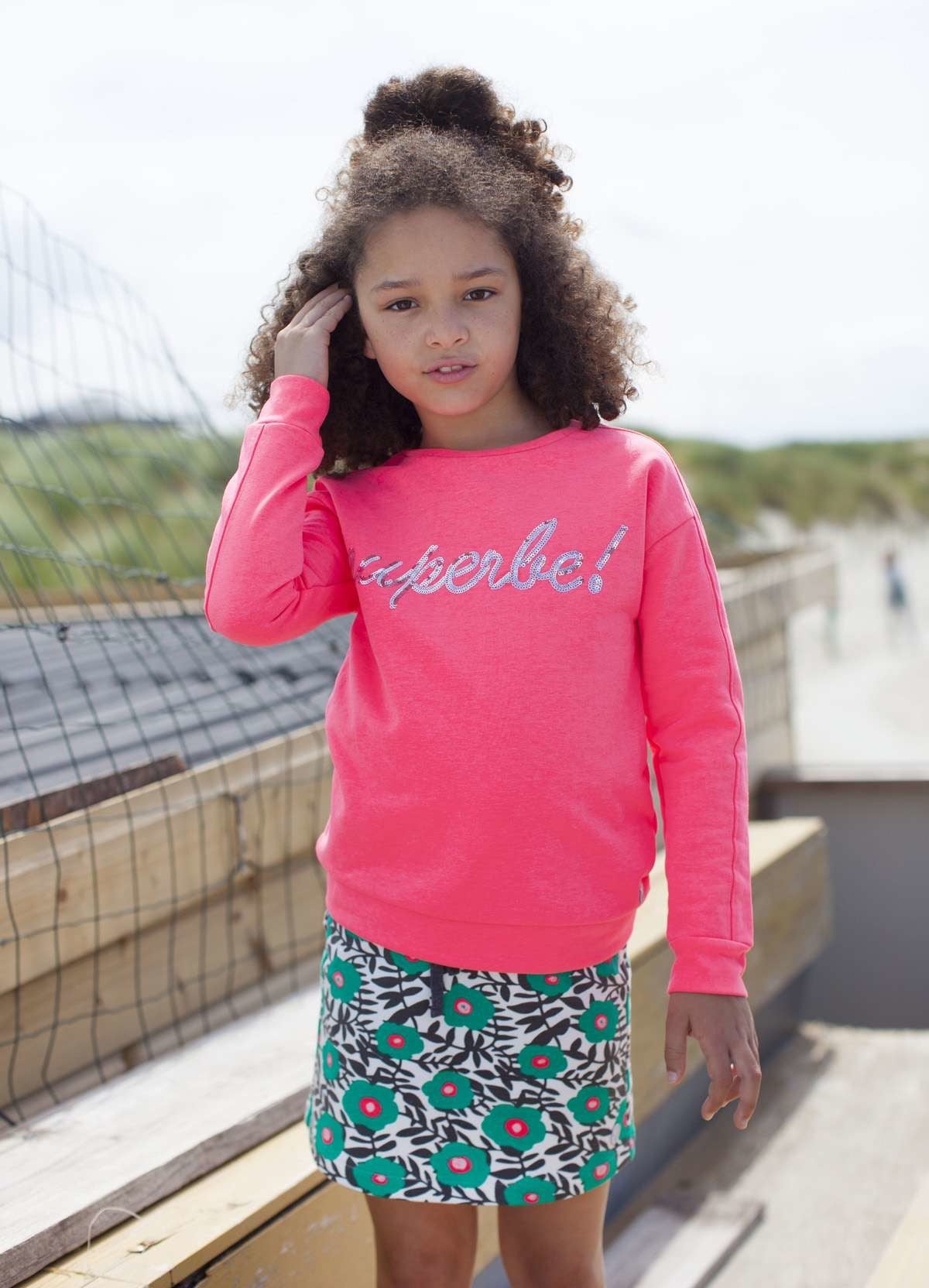 Moodstreet sweater voor meisjes in de kleur neon roze. Deze sweater is gemaakt van katoen met elastan. Het item is voorzien van een tekst in zilveren pailletten en elastische boorden aan de uiteinden. Bovendien is de binnenkant héérlijk zacht geruwd. Combineer met een Moodstreet jeans voor een casual look of met een rok voor een stoere look!
