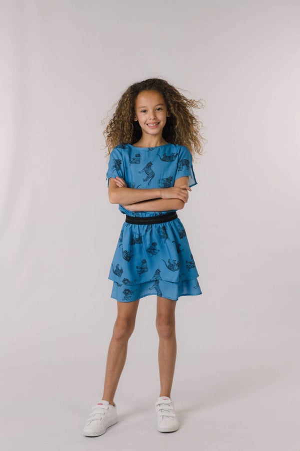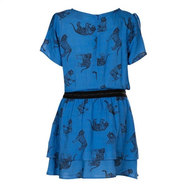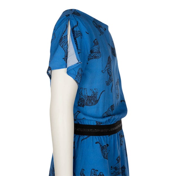 Prachtige jurk van KIEstone. De jurk heeft een all-over print met blauwe tijgers en zit heerlijk comfortabel. Met deze mooie jurk ben jij klaar voor de zomer! In het voorjaar al te dragen met een vestje of denim jack.