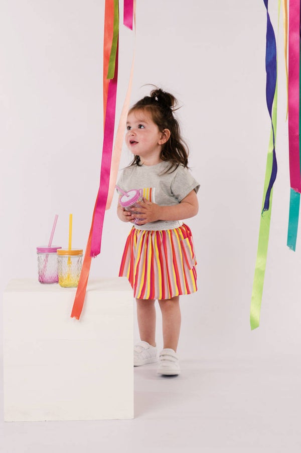 Mooi basic t-shirt van Kiezeltje. Op de linkerschouder zitten knoopjes. Bij de uiteinden van de mouwen zit een vaste omslag. Een vrolijke opdruk: OUI! in de kleuren roze, geel, oranje en wit. Goed te combineren met de rokjes van Kiezeltje, zoals de gestreepte, gebloemde of gele rok van Kiezeltje.