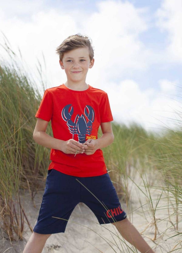 Moodstreet T-shirt met korte mouwen voor jongens in de kleur oranjerood. Het item is voorzien van een ronde hals en heeft een rubberen opdruk van een kreeft met de geborduurde tekst 'FOLLOW THIS FELLOW'. Combineer met een Moodstreet (denim) shorts of jeans voor de complete look!