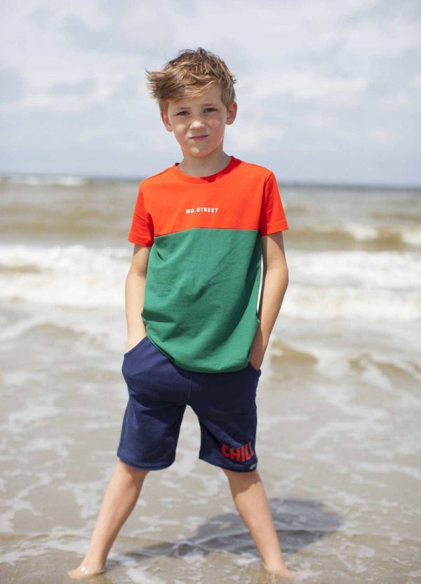 Moodstreet T-shirt met korte mouwen voor jongens in de kleuren oranje en groen. Het item is voorzien van een ronde hals en verschillende kleurvlakken. Combineer met een (denim) short of jeans van Moodstreet om je outfit helemaal af te maken.