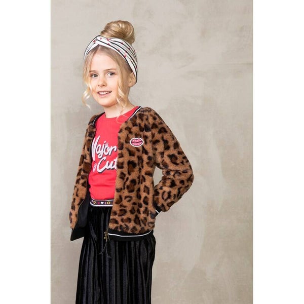 Lekker warm fake fur vest in een bruine panterprint. De kiss applicatie is een leuk detail. Ook erg goed als tussenjas te gebruiken.