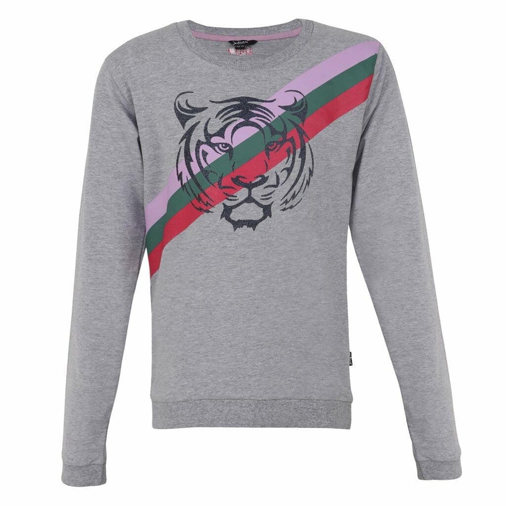 Go get 'em tiger! Deze sweater is comfy, maar tegelijkertijd superstoer door de Japanse tijgerkop en de gekleurde diagonale strepen in lila, groen en roze.