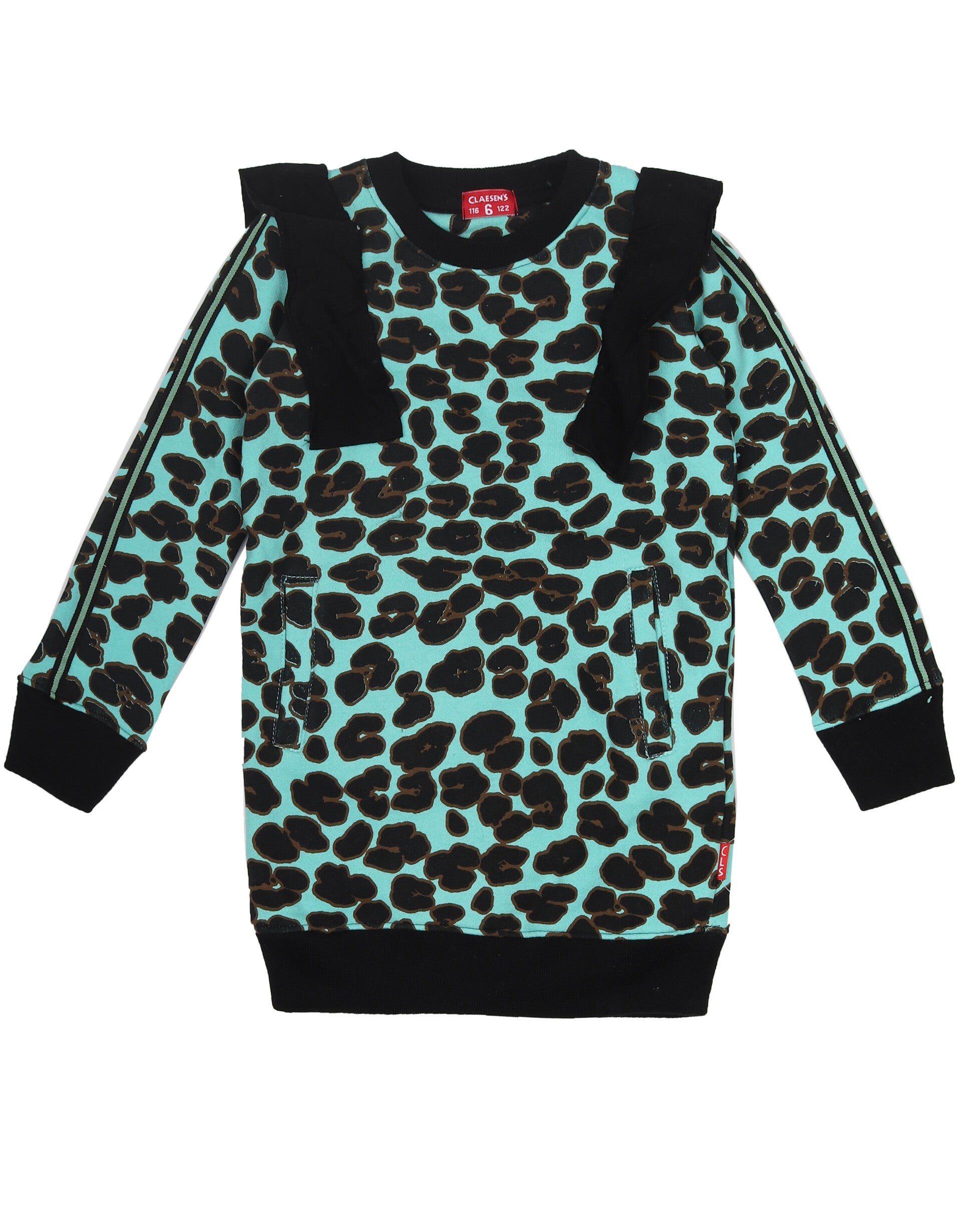 Meisjes sweaterjurk met ronde hals in turquoise met een bruinzwarte panterprint. Het jurkje heeft zwarte ribboordjes langs de hals, mouwen en onderkant. Het heeft zwarte ruches op de schouders en op de mouwen een turquoise/zwart gestreepte bies. Gemaakt van 100% Cotton Fleece. Deze sweaterdress is heel comfortabel en leuk om te dragen met een van onze bijpassende leggings.
