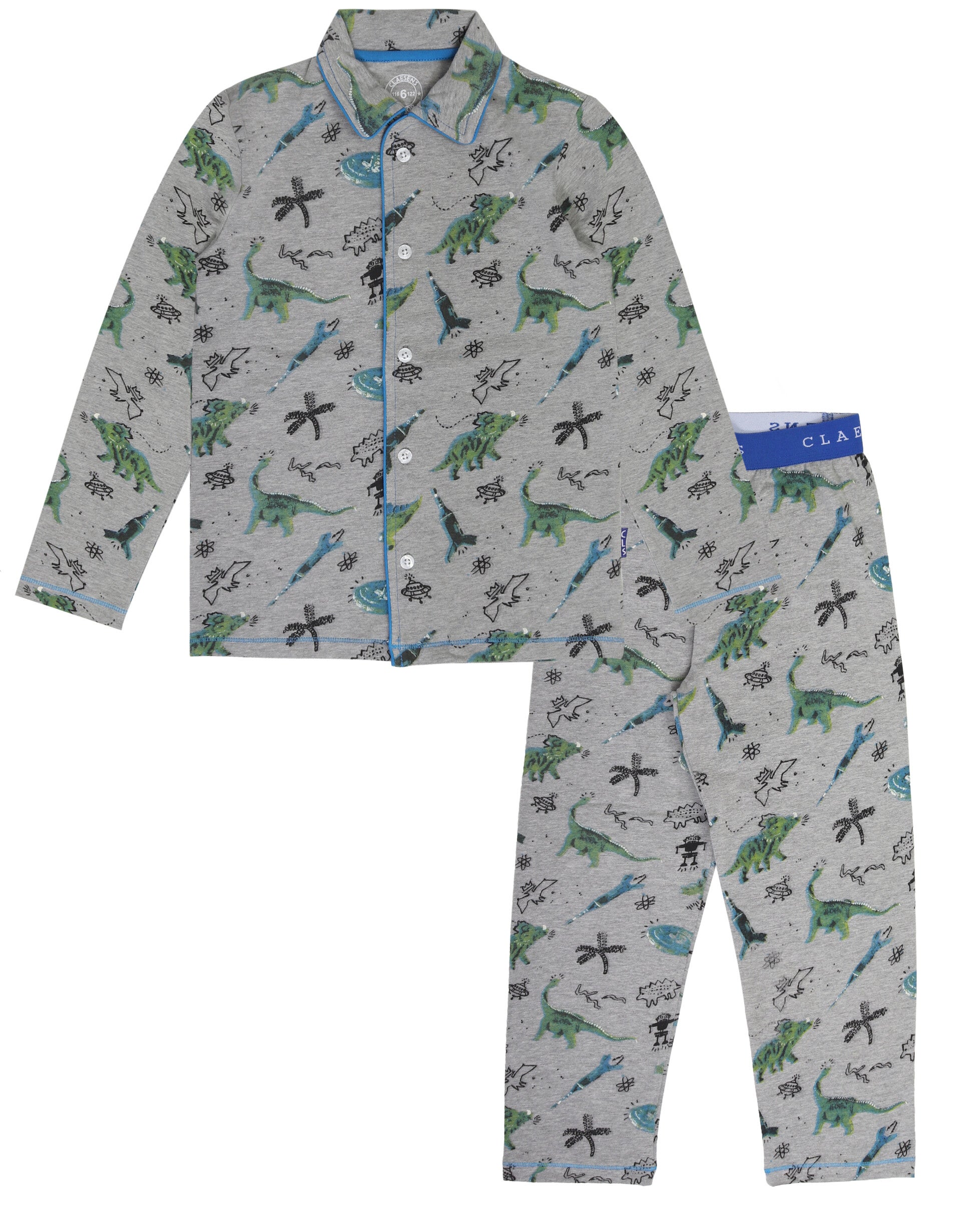 Jongens klassieke 2-delige pyjamaset in grijsmelee met een multicolor dinosaurusprint. Het pyjamajasje heeft een kraag, lange mouwen en een knoopsluiting aan de voorkant. De pyjamabroek heeft een felblauwe elastieken tailleband met een wit Claesen's logo. Felblauwe stiksels als accent. Deze pyjamaset is heerlijk om in te slapen en heel comfortabel om de hele dag in rond te lopen. Gemaakt van hoogwaardige katoen/lycra (95% cotton/5% lycra).