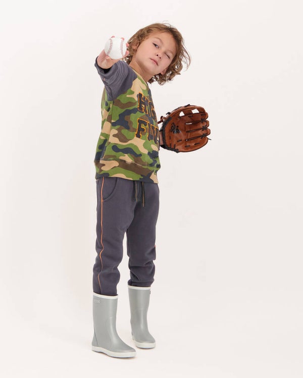 Jongens lange joggingbroek in donkergrijs. De joggingbroek heeft een rib tailleband met elastiek en een aanrijgkoordje, twee steekzakken aan de voorkant en ribboorden aan de onderkant. De broek heeft een oranje contrastpiping als accent. Gemaakt van 100% cotton fleece. Deze broek is heel comfortabel, heerlijk zacht en is heerlijk om de hele dag in te relaxen.