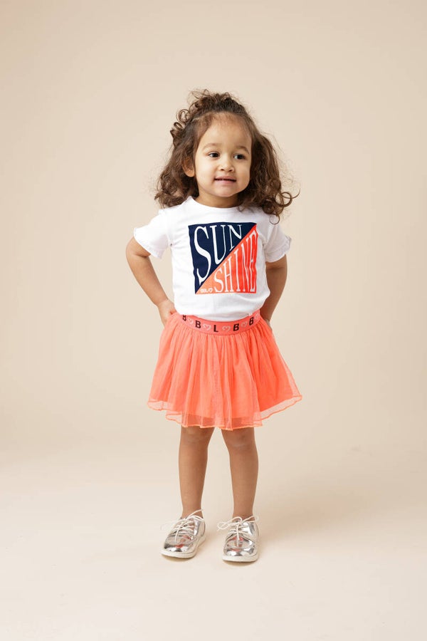 Swing in this skirt! Met deze koraalkleurige tule rok swing jij deze zomer als een echte pink lady op ieder terras. De elastieken BBL logoband houdt het rokje goed op zijn plaats.