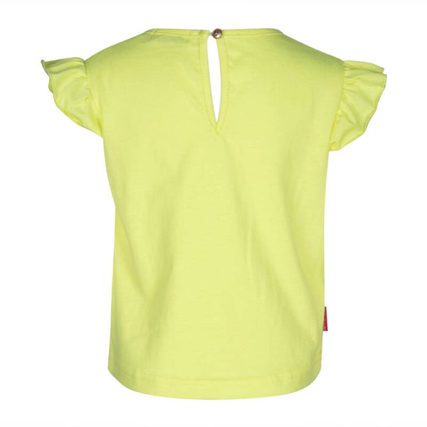 Mooie top in een opvallende limegroene kleur, met een rufflemouw. Leuk te combineren met de donkergroene rok uit de Kiezeltje zomercollectie, of stoer op een jeans.
