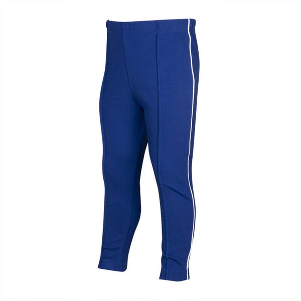 Mooie sportieve kobalblauwe broek met een witte bies op de zijkanten. Combineer bijvoorbeeld met de witte ribtop of de babyblauwe sweater uit de Kiezeltje zomercollectie.