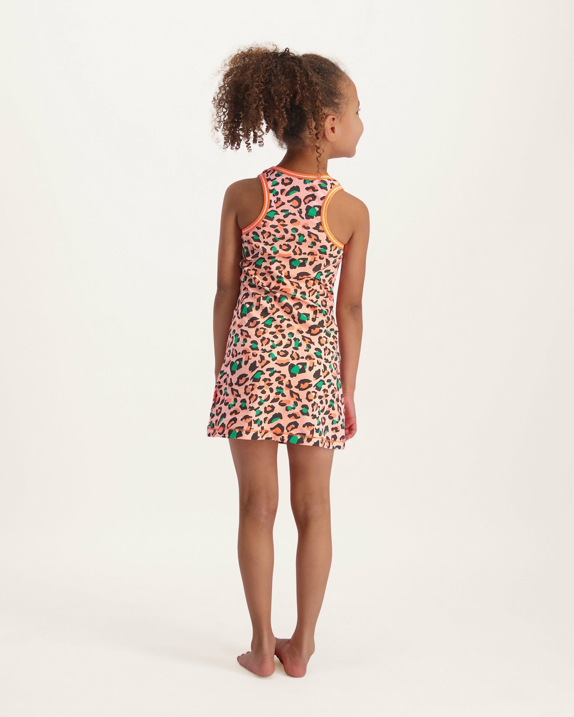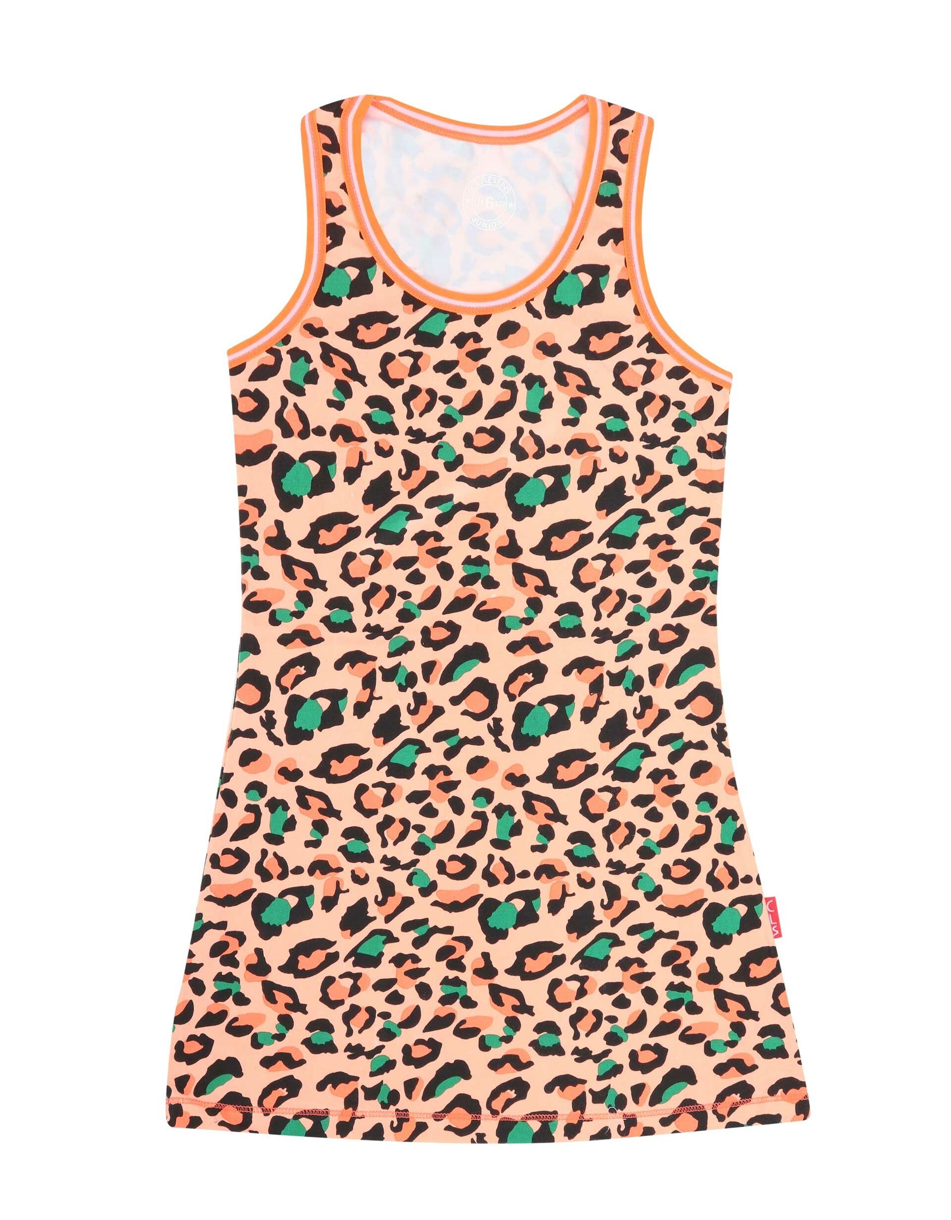 Jurkje met een ronde hals in oranje met een multicolor panterprint. Het jurkje heeft brede bandjes en oranje/wit gestreepte biesjes langs de hals en de mouwen. Oranje stiksels als accent.