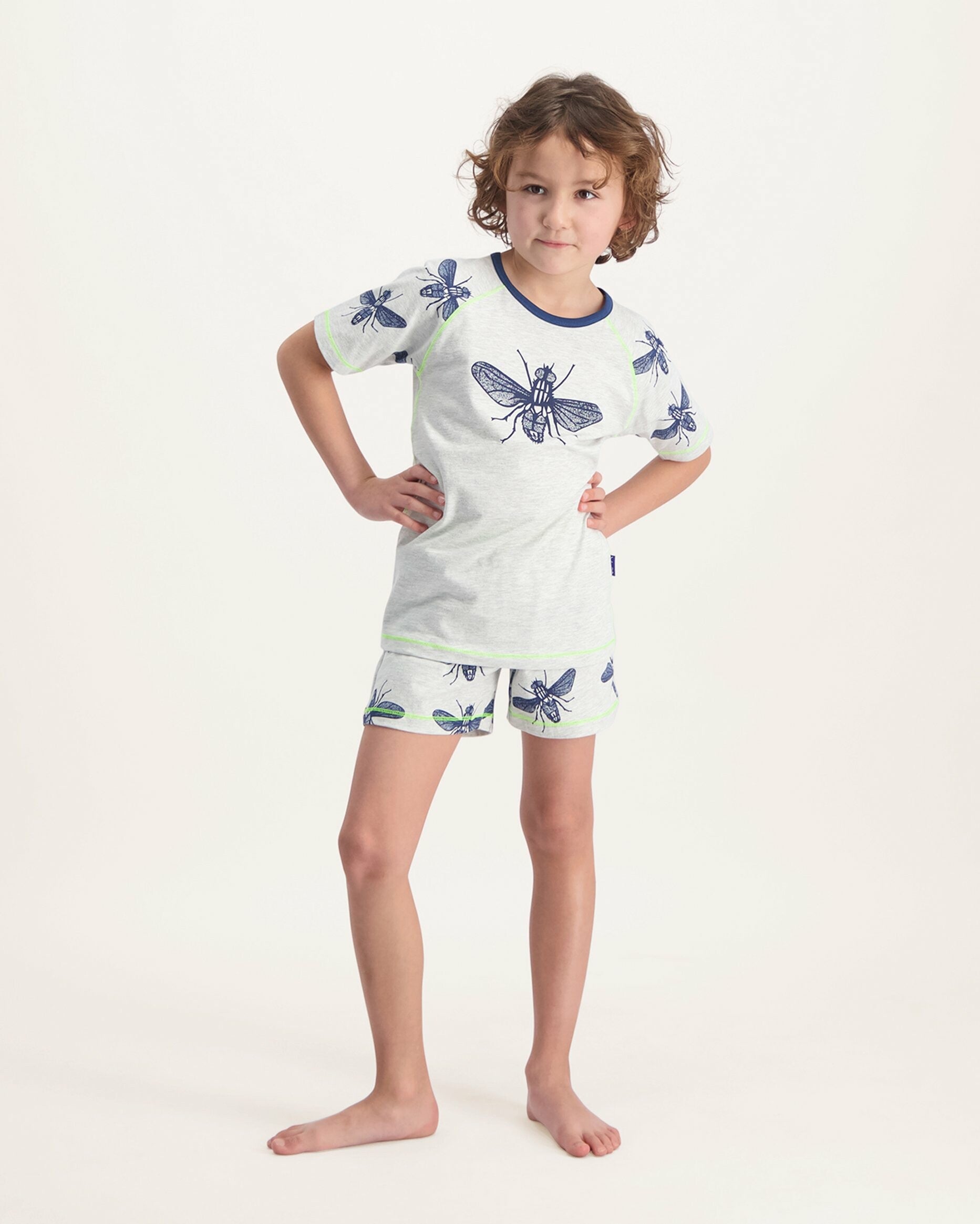 T-shirt met ronde hals in lichtgrijs melange met op de voorkant een print van een grote vlieg. Het t-shirt heeft een navy biesje langs de hals en korte raglan mouwen in licht grijs melange met een allover vliegenprint. De short is in lichtgrijs melange met een all-over vliegenprint. Het shortje heeft een neongele elastieken tailleband met een wit Claesen's logo. Gele stiksels als accent. Deze pyjamaset is heerlijk om in te slapen en heel comfortabel om de hele dag in rond te lopen.