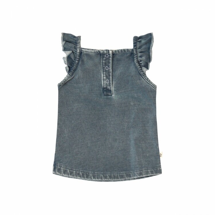 Knitted Denim in light blue! Een comfortabel item en easy to match. De Ruffle Singet heeft geen mouwen, en is daarom ideaal voor de zomer. Op de schouders zitten speelse ruffles.