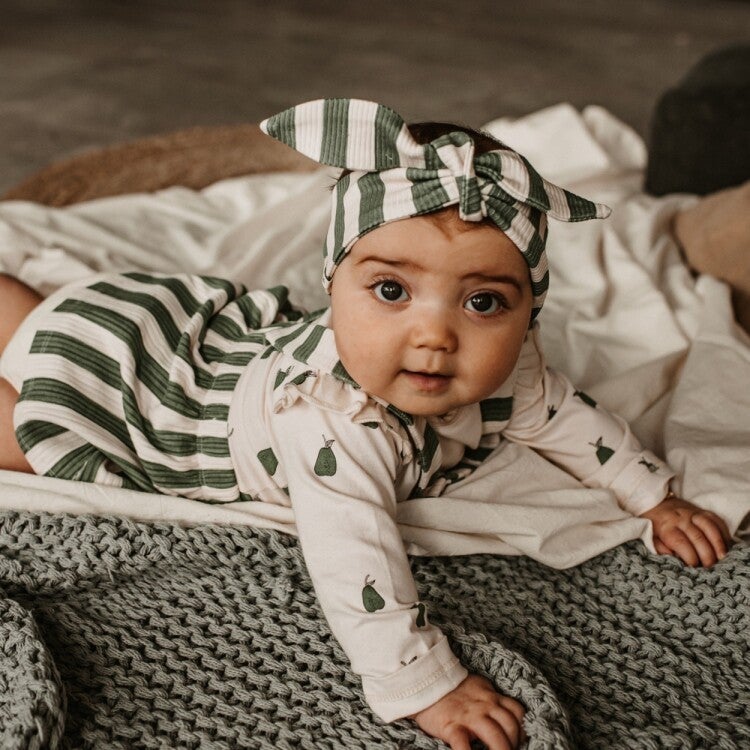 Een speels printje met peertjes in een oudgroene tint. Deze longsleeve is van zacht katoen met een mooie all-over print. Het model heeft twee drukknoopjes op één van de schouders. De top is afgewerkt met girly ruches. Leuk te combineren met de gestreepte dungaree dress en haarband!