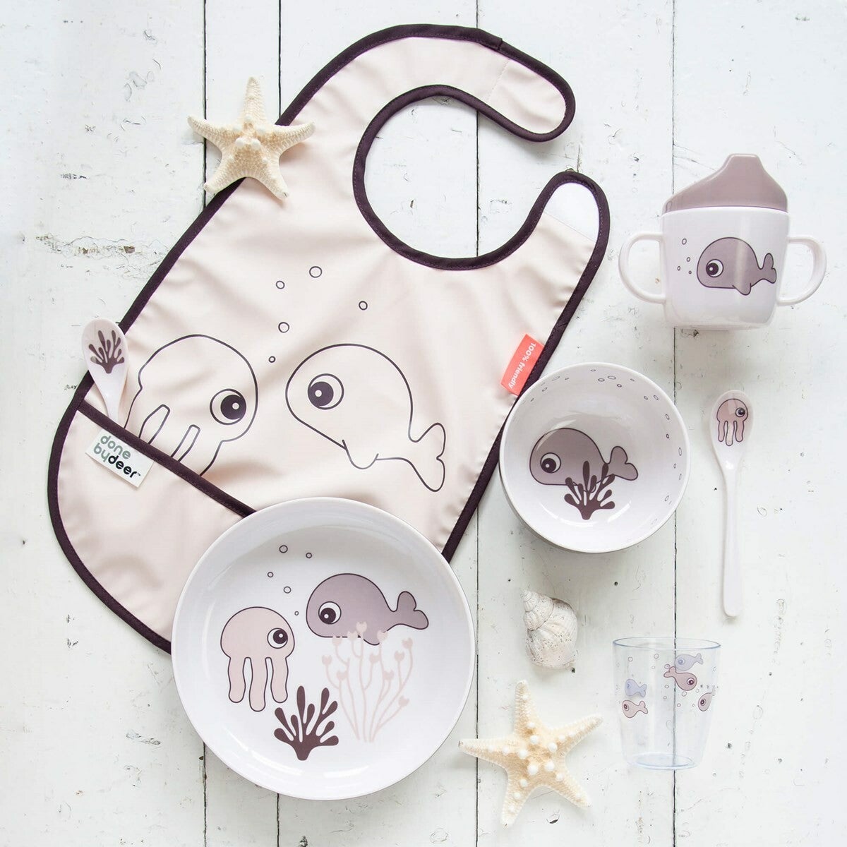 Praktisch slabbetje met een schattige print van 'Sea friends'. Het slabbetje heeft een gemakkelijk af te vegen en waterdicht oppervlak en het vakje vangt eten op.