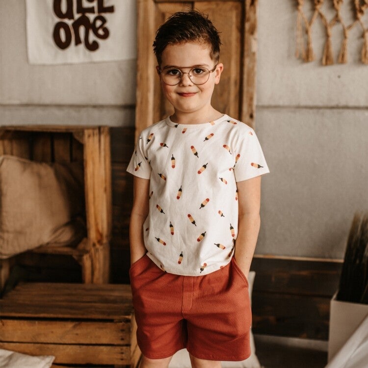 Deze short heeft een mooie ribkwaliteit in een terra kleur. De long short is wat langer dan de shorts en daardoor ook zeer geschikt voor stoere jongens!