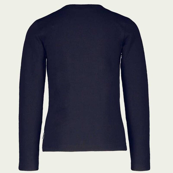 Dit basic navy Moodstreet longsleeve shirt is comfy en heeft een leuke glitterprint op de voorkant. Leuk te combineren met het blauwe bloemenrokje of de blauwe ribflared pants van Moodstreet