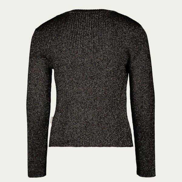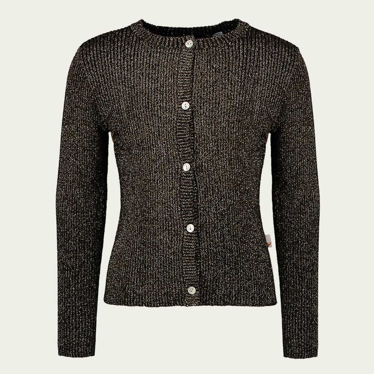 Moodstreet's old-time favorite, dit zwarte gebreide vestje met een velugje goud lurex. Kan open of dicht gedragen worden door de makkelijk voorsluiting met knoopjes.