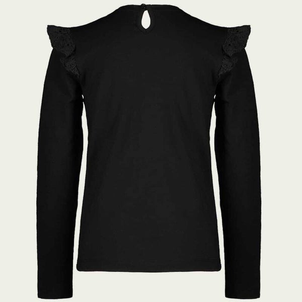 Een heerlijke comfortabele Moodstreet top, in een fijne single jersey met elastan. Stoer zwart en helemaal af door de ruffles van prachtige broderie. Zo prachtig te combineren met het rib rokje in een roestbruine kleur.