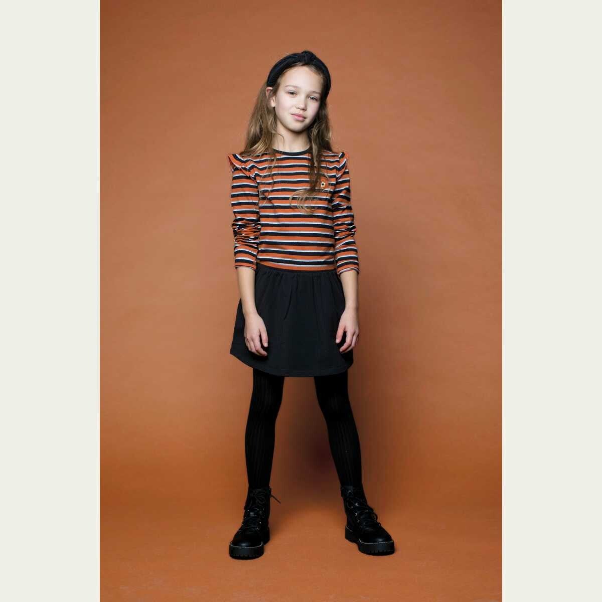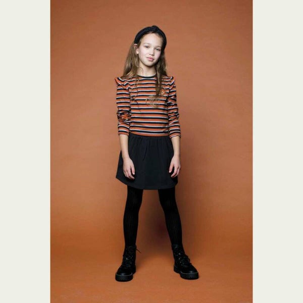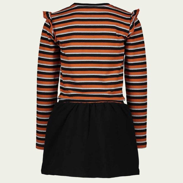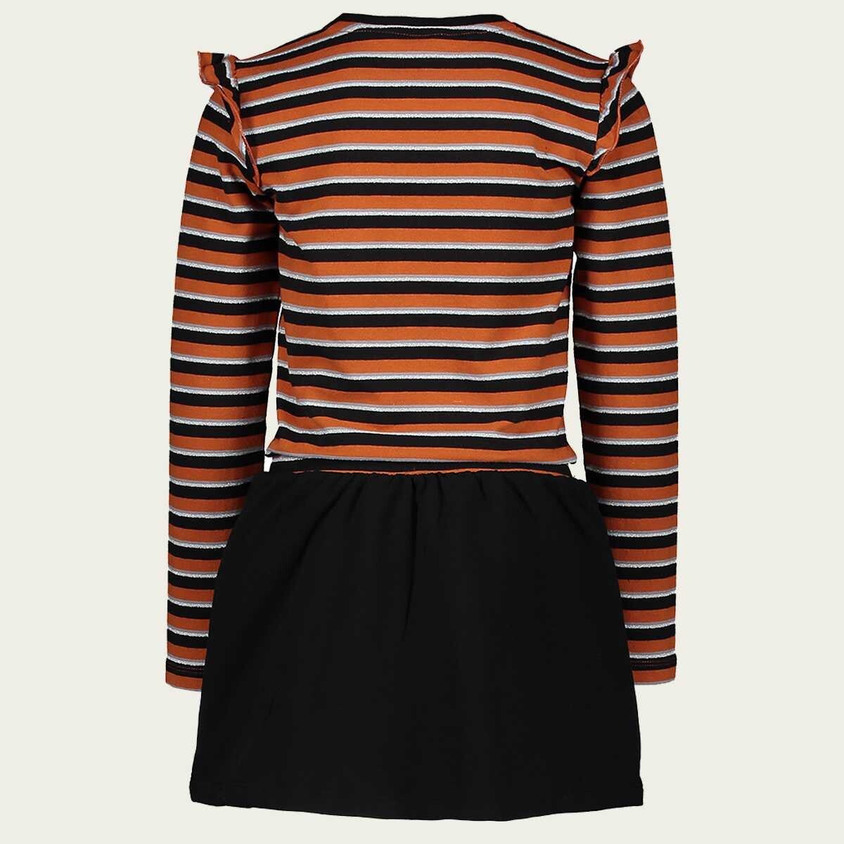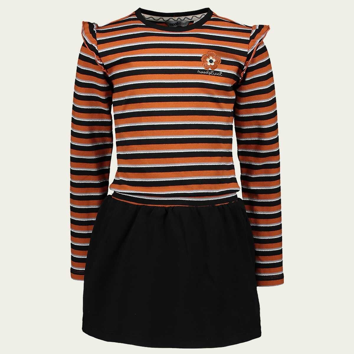 Altijd een hit, zo'n Moodstreet jurkje van verschillende stofjes. De top is van een hippe gebreide streep in t-shirt stof, in warme kleuren als roest, zwart, warm white en goud lurex. Het rokje is van een comfi zwarte sweatstof.