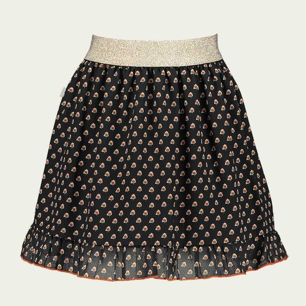 Prachtig en hip, dit mooie Moodstreet rokje! Gemaakt in een geweven recycled polyester met een een stoere bloemenprint. De elastiek tailleband in gouden lurex maakt 'm helemaal af!