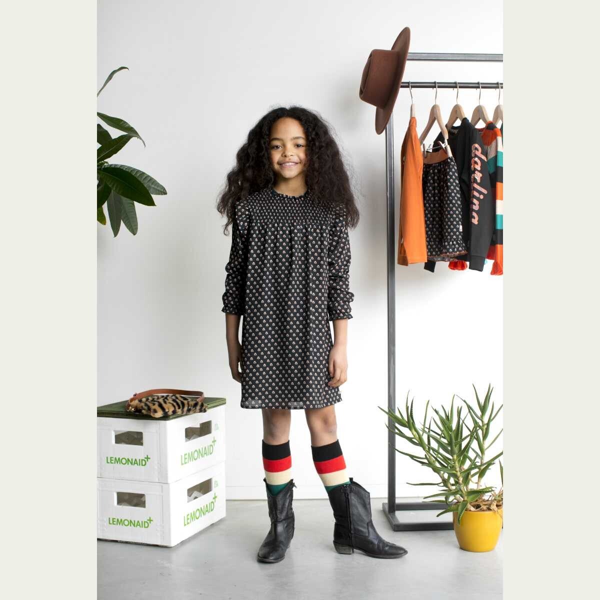 Prachtig en hip, dit mooie Moodstreet jurkje! Gemaakt in een geweven recycled polyester met een een stoere bloemenprint. Het smockdeel aan de bovenkant en de roezels maken 'm helemaal af!