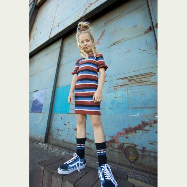 Superhip dit Moodstreet fancy gebreid streepjurkje in een mooie kleur terra, een stoere blauw, zwart en een lurex gouden streep. Het jurkje heeft een korte mouw met een leuke ruffle als finishing touch.